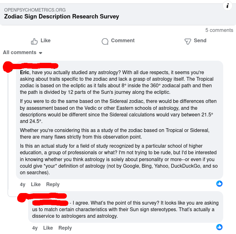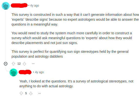 The concept of astrology goes back to antiquity and there are many different strains and traditions. In popular culture, most people know of what is called "sun sign astrology" where people are divided into 12 different signs based on their birth date, and peoples personalities are supposed to be determined by their sign. This is a simplified version of what people who get deep into astrology think is 'true astrology', something along the lines of divination using the time and place and of person's birth and a complicated charting method. So it does need to be acknowledged that many of the people deep into astrology would reject the whole premise here. See the comments I got on facebook (left) and reddit (right) when first trying to recruit volunteers, these were pretty representative.
