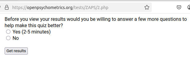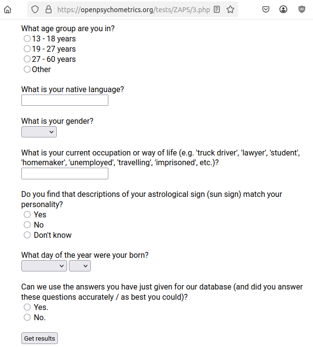 The other questions on that page were to help generate items to test. The survey was originally launched with 72 items sourced from web profiles of the signs (6 each) and 1 item each from the SAPA-27, to cover the full spectrum of personality. After initial data came in more items were generated using the user suggestions for signs where more items were needed. A total of 175 items were tested. The survey was adaptive. Items that did not seem promising (voters did not agree) stopped being evaluated after initial data, while good candidates were included in the survey until they got at least several hundred votes.